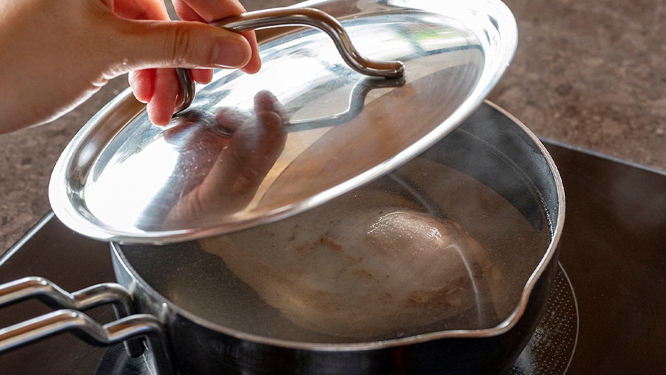 火を止めたら蓋をして、冷めるまで茹で汁につけたままにしてください。この間にゆっくりと火が通り、しっとりと仕上がります。