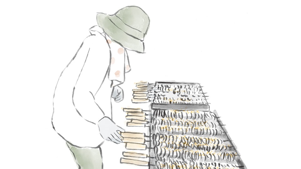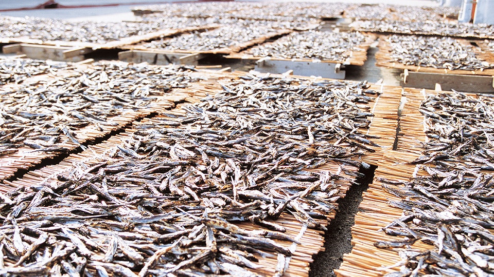 水揚げされたトビウオを香ばしく焼いた「焼きあご」。煮干しの場合は、イワシなどを煮て(茹でて)干してつくります。だから、〝煮干し〞というのですが、あごは焼いてから干す。つまり、煮干しではなく〝焼き干し〞なのです。あごは、焼くことでうまみがギュッと凝縮するだけでなく、香ばしい風味が加わります。さらに、焼いている間に余分な脂が落ち、両面を焼くことで、わた(内臓)もしっかり焼けて、えぐみも落ちていくので、雑味の少ないクリアで上品なだしがとれる焼き干しになるのです。焼き上がったあごは、しっかり干して、焼きあごが完成します。