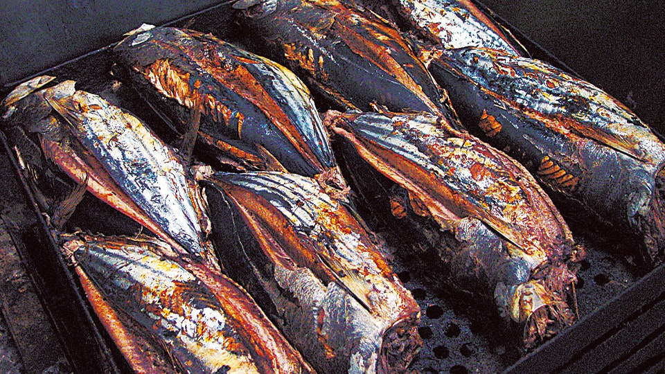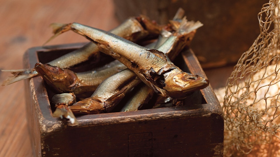 鰹節のように注目されることは少ないですが、うるめいわしを燻した〝節〞のうまみとコクは、「茅乃舎」のだしには欠かせません。うるめいわしは、水揚げしたら煮釜で煮ます。煮上がったら、時間をかけて燻し、乾燥させて、じっくりとうまみを閉じ込めます。うるめいわしのうまみ成分は、鰹節と同じイノシン酸。だしのおいしさを、側面から力強く支えてくれる心強い存在です。