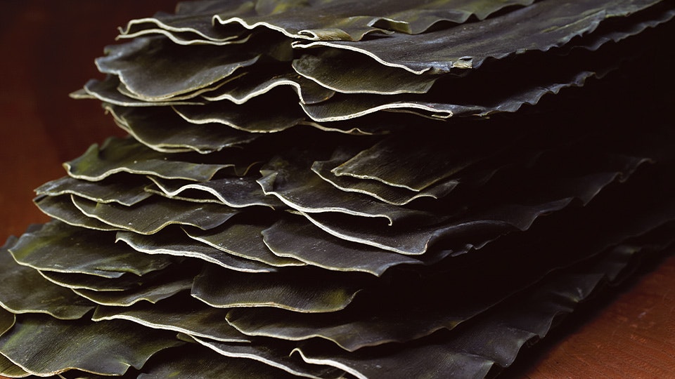 昆布のほとんどは、北海道で収獲されます。産地によって、昆布の特徴が異なります。真昆布、羅臼昆布、利尻昆布、日高昆布など、代表的な品種は4種類。「茅乃舎だし」には、澄んだ上品なだしがとれる真昆布を使っています。それから、北海道最北の海でとれる利尻昆布は、繊維が硬く、濁らないので、京都の料亭などでよく使われていますが、「茅乃舎」では、「特選 茅乃舎極みだし」「昆布だし」などに使っています。昆布のうまみはグルタミン酸。鰹節や焼きあご、うるめいわしのイノシン酸と組み合わせることで、うまみが倍増し、この上なくおいしいだしになってくれます。
