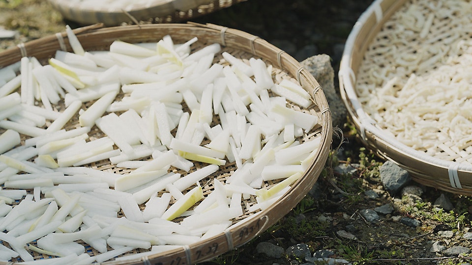 干した大根は長く保存できるという利点とともに、大根の甘みやうまみが太陽の力も得て濃縮されて美味しくなります。一般的に切り干し大根は煮物にすることが多いですが、長野おばあちゃんは、お味噌汁はもちろん、卵とじなど様々なものに使うそうです。「卵とじは切り干し大根の自然な甘みで、砂糖は入れなくても甘く、滋味深く仕上がるんです」