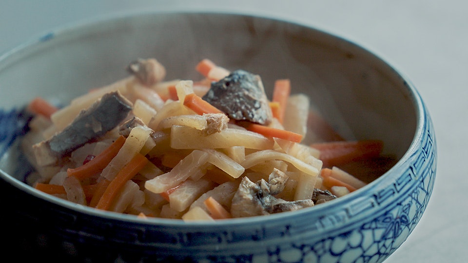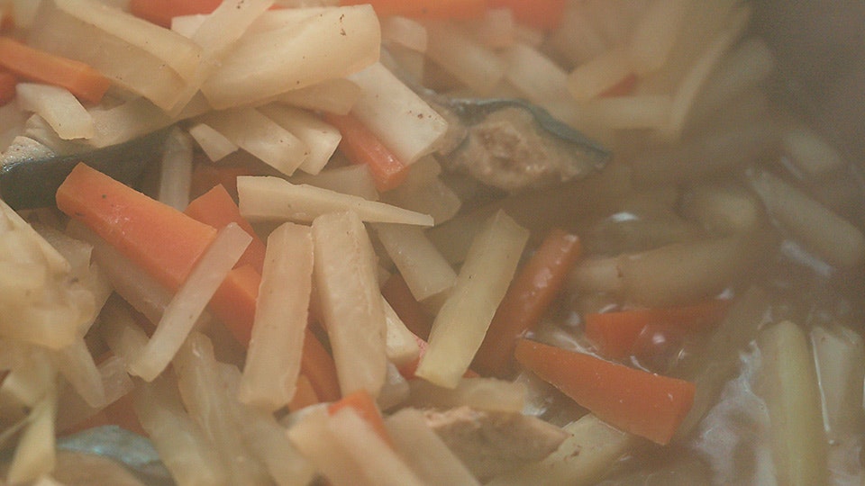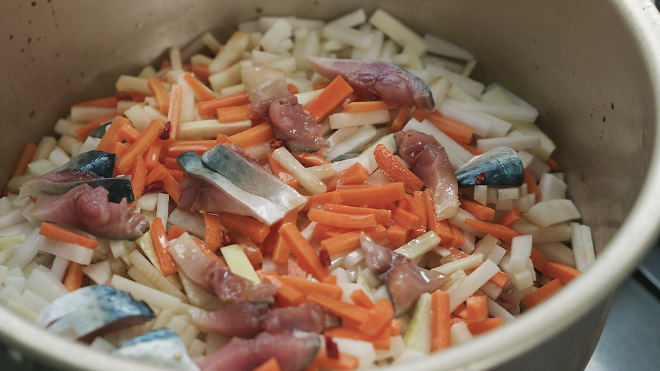 作り方は、大根と人参と鯖を大きな鍋で、醤油・酢・お砂糖を入れて煮込みます。混ぜはせず、鍋をしっかり持ち上げて天返しするのがおいしく作るコツだそう。甘酸っぱく、温かいもので、何度でもぬくめ直して(あたため直して)食べられます。唐辛子のほんのりピリリと辛い風味が、寒さに縮んだ体を温めてくれます。