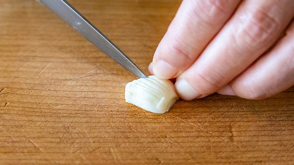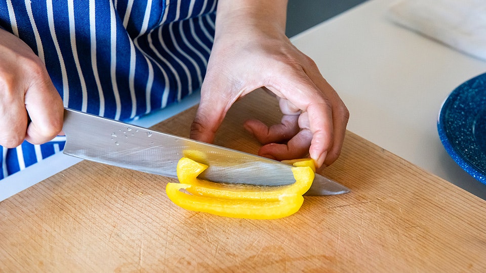 「これも玉ねぎと同じ要領。ただ小さいナイフを使って、刃先から引くようにして切るとやりやすいかも。ちなみに私は刃渡り9cmのペティナイフを使ってます」