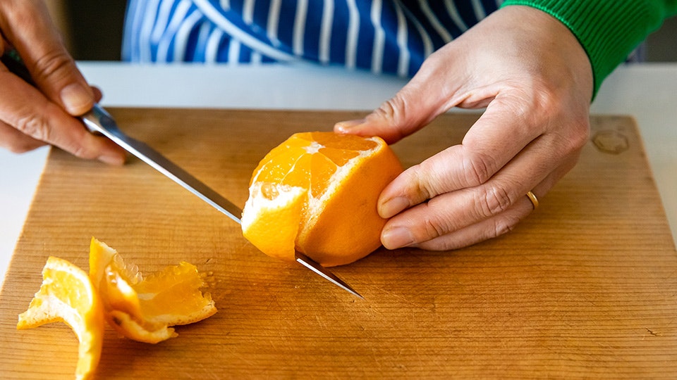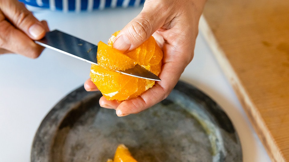 お次は、広沢さんが「ホテルでアルバイトしていた時に身に付けた」という秘伝?柑橘の実だけを残す切り方です。