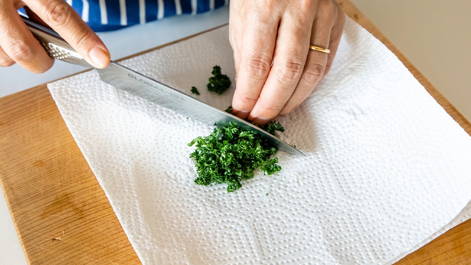 そして、ふきんは必ず2枚用意して。「ずれないようにまな板の下にかませる用と、ひとつの食材が切り終わったあと、まな板の水気や汚れを拭く用。この『さっと拭く』を意外としてない人が多いかも」