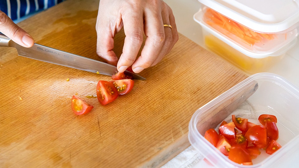 「キッチンが狭くてスペースがとれないわ」という人は?「トレイではなく、ふた付きの容器にして、切ったものを重ねておくと省スペースになりますよ」