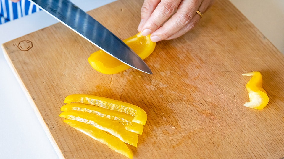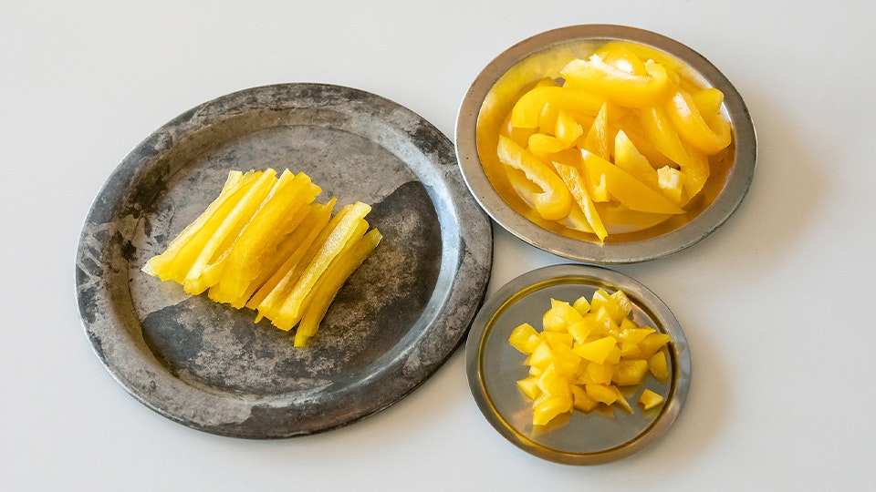 あとパプリカをきれいに千切りにしたい場合も、わたを取り除いて、くるっとしてるはしっこの部分を先に切り落としてから千切りにすると、きれいに揃いますよ。残りは同じくみじん切りに」