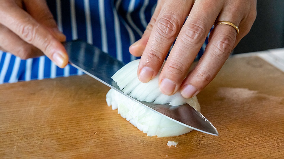「まず半分に切って。縦と横にそれぞれ切り込みを入れてからスライスする。包丁で叩いて切るのは最後の仕上げだけくらいにしておくと、バラバラとなりにくいですね」