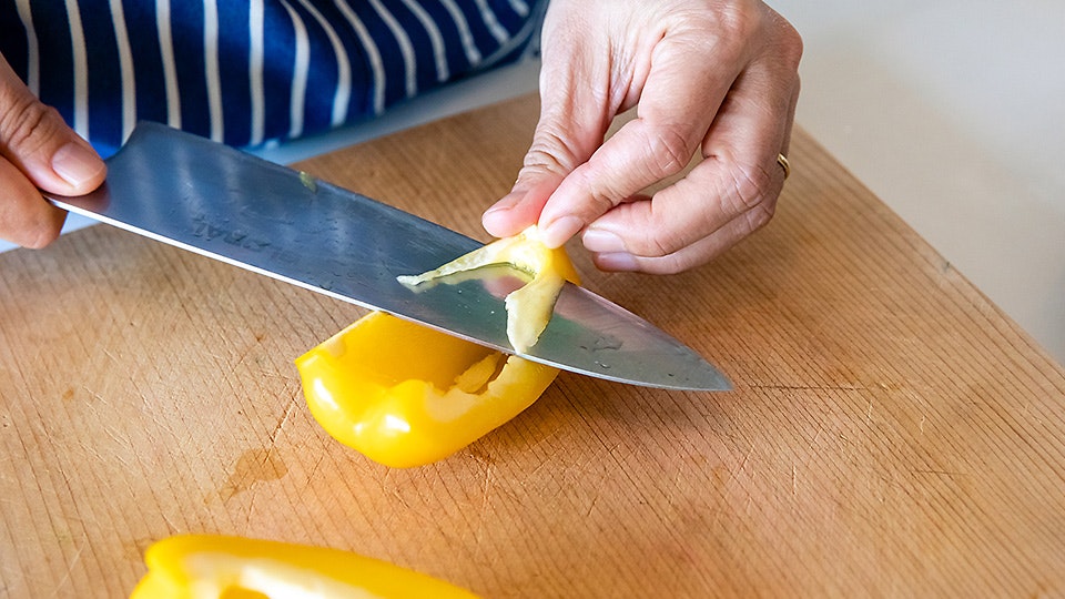 「ヘタを切って安定させて、外と中の皮を削ぐように切ってから、中の皮と皮の間に切り込みをいれて切ります。むくよりもこっちのほうがきれいで簡単にできますよ」