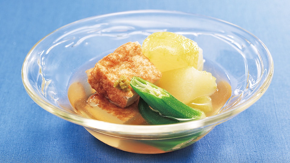 おでんといえば、思い浮かぶ野菜の具といえば、大根やじゃがいもでしょうか。ですがこちらは具も夏仕様、おくらと冬瓜、そして厚揚げを使います。