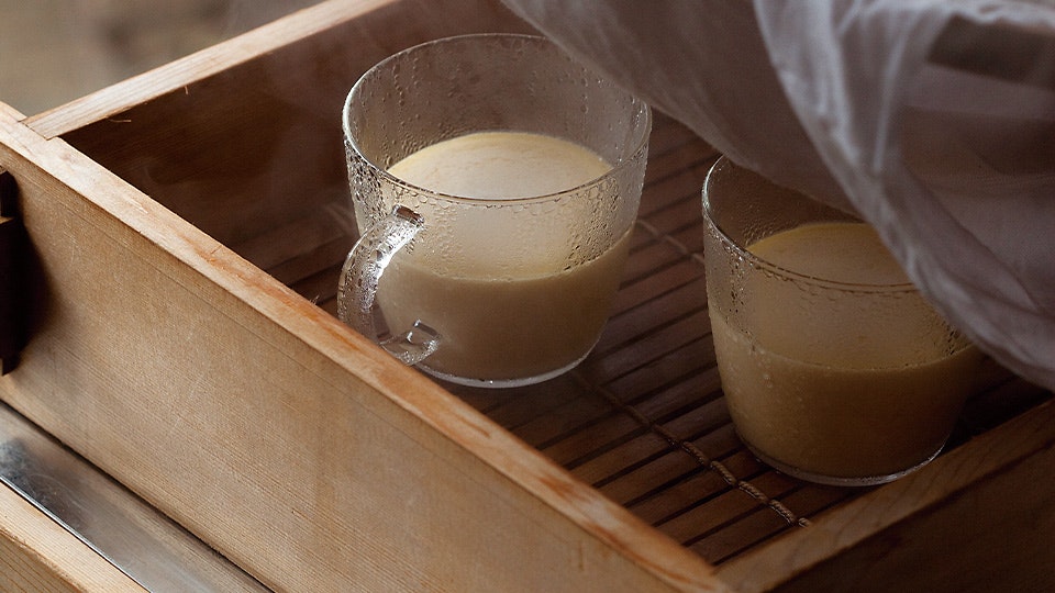 写真のように蒸し器があればそれもよし、なければ鍋に器の半分の高さまで水を張り、蓋をして蒸してもだいじょうぶ。