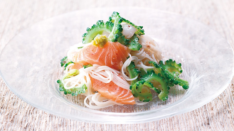 キモはにがうりのグリーンと、サーモンのオレンジ。おたがいの鮮やかな色が組み合わさることで引き立てあって、きれいな相乗効果をもたらします。