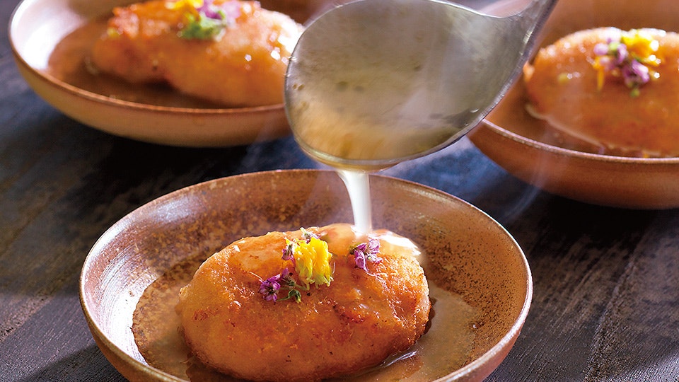 餡は「昆布だし」の繊細なうまみを引き立て、最後の一滴まで飲み干したくなるようなやさしい味付けに仕上げます。かりっ、もちもち、ほくほく、とろり。秋の根菜のおいしいリズムに、思わずうっとり。