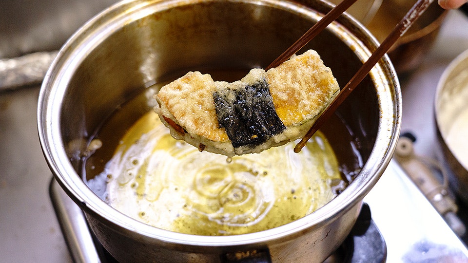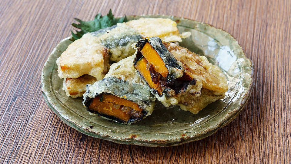 仕事の合間に食べるお昼は、さっとつくれてしっかり食べられるものをと、牛肉を挟んだ天ぷらを用意。甘辛く煮た玉ねぎと牛肉をかぼちゃで挟んで海苔を巻き、天ぷら粉に通してサクッと揚げます。