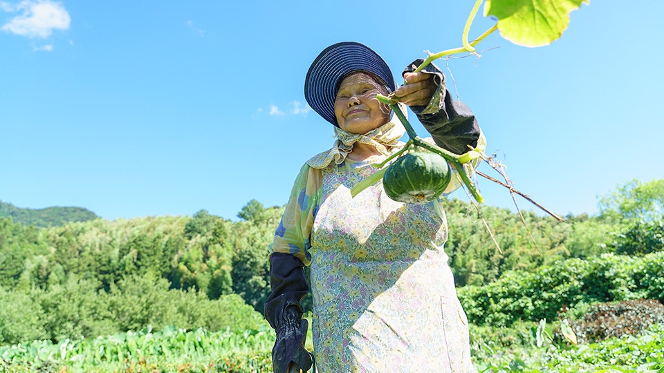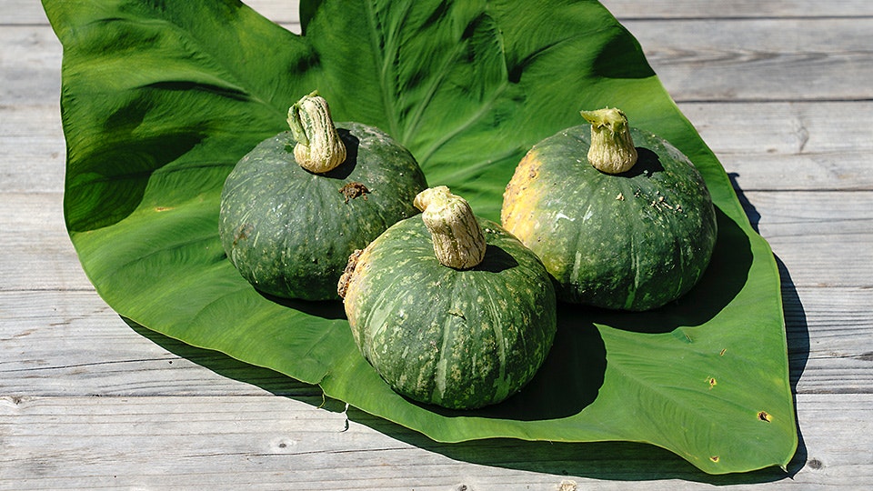 畑を訪れたのは、7月の終わり。手にしたのはコロンと実ったかぼちゃです。収穫は夏から秋にかけて、長く保存できるので一年を通してお世話になる食材ですが、普段なかなか使い切れない大きなひと玉は、ばっかし料理にうってつけ!