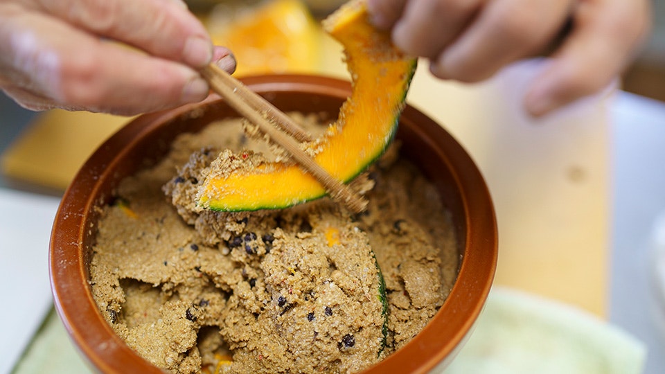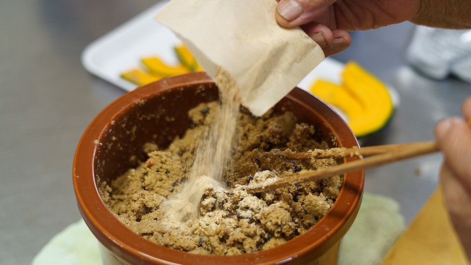 「朝ごはんは漬物と汁物があれば十分」と、漬けておいた「かぼちゃのぬか漬け」を取り出します。長野さんのぬか床には昆布や山椒、赤唐辛子が入っていますが、うまみを足したい時は、「茅乃舎だし」の出番。約2kgに対して1袋を破って入れてよく混ぜ込みます。