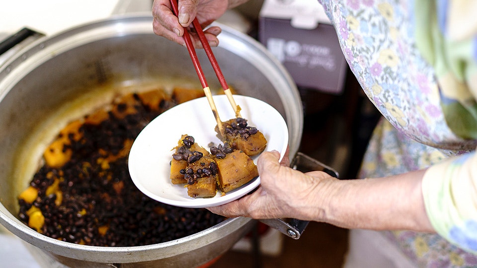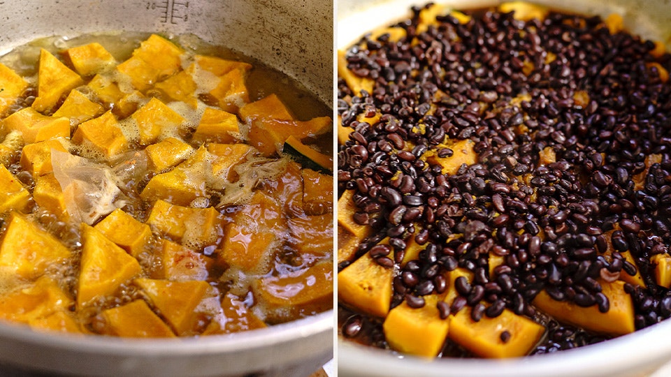 かぼちゃといえば、煮物は欠かせません。長野さん流の「いとこ煮」を伝授いただきましたよ。立ち寄った人にも振る舞うために、たっぷりと大鍋で調理します。「まさめ」という地豆を使用しますが、一般的な小豆でも代用いただけます。