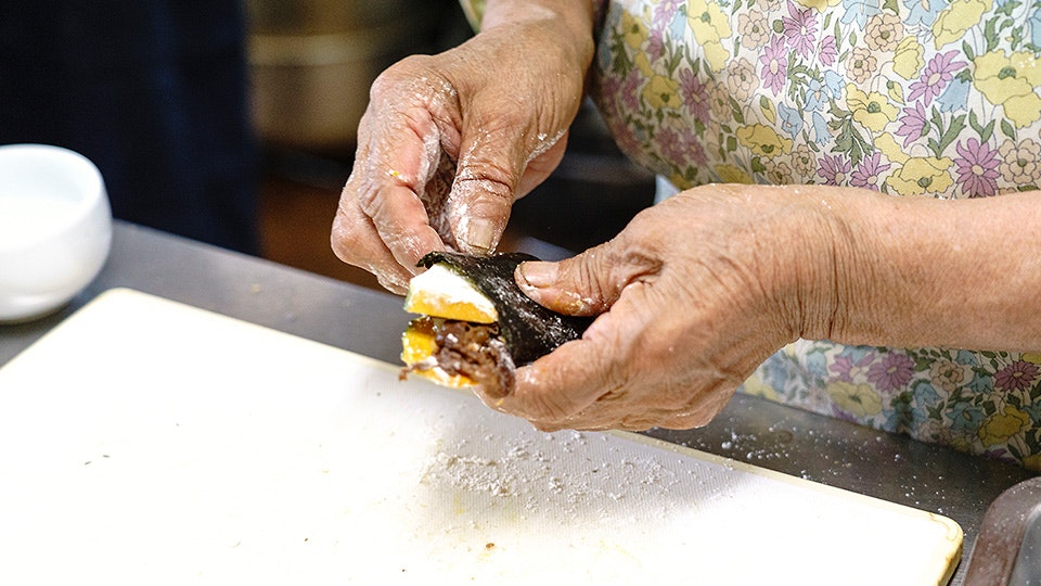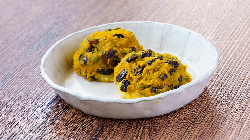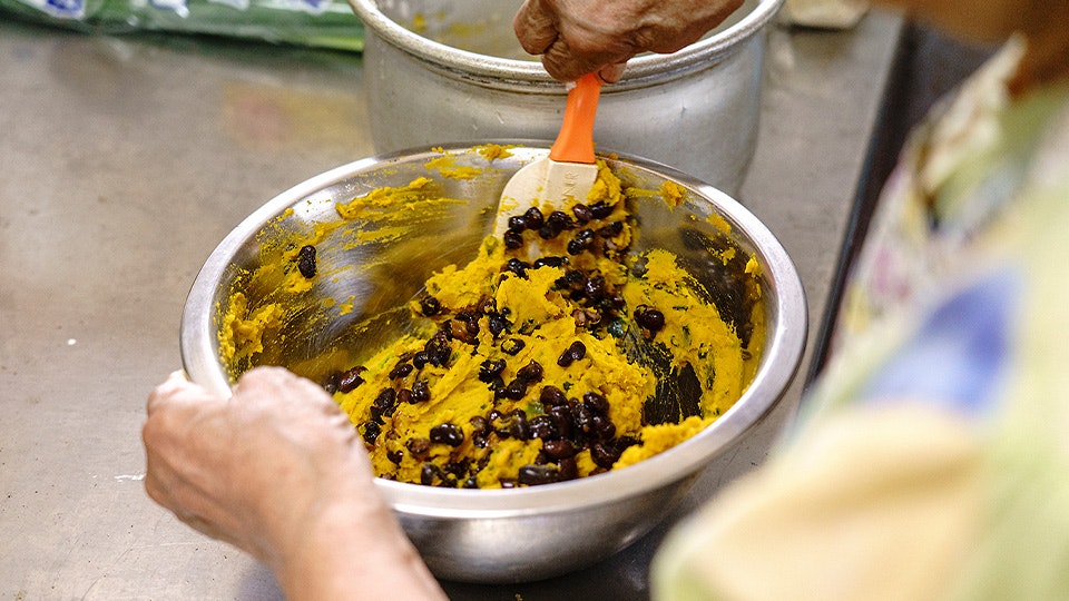 蒸しあがったかぼちゃに塩を少し加えてつぶします。「これも足そうか」と、いとこ煮のまさめも混ぜ込んで、つぶして丸めた餅米を包みます。