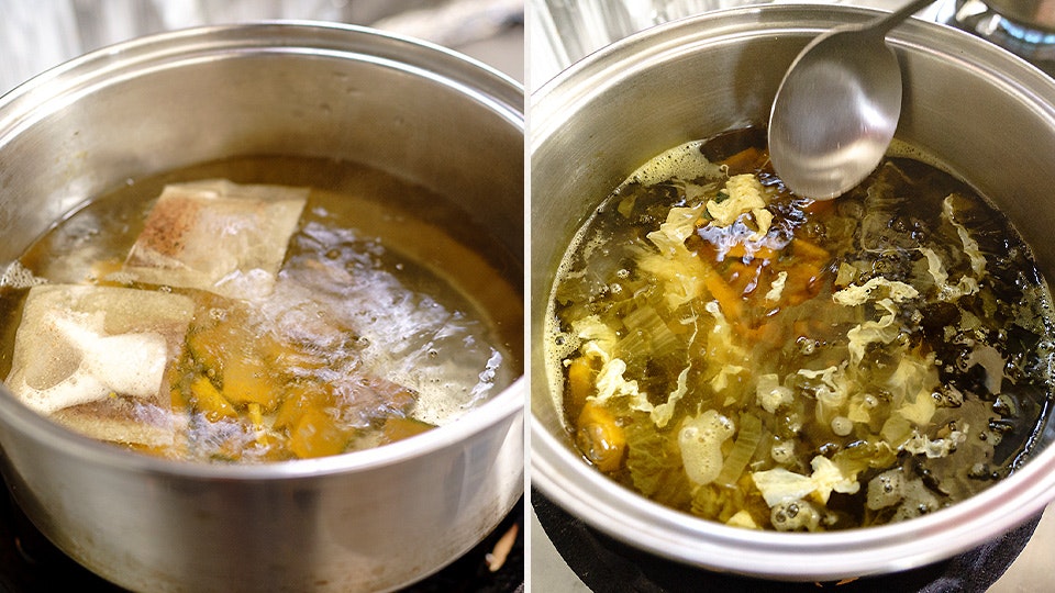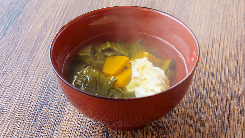 続いてスープをつくりましょう。「茅乃舎だし」でかぼちゃを煮て、味付けは高菜漬けで。たまごを溶き入れれば、ほんのり酸味が効いたスープの完成です。