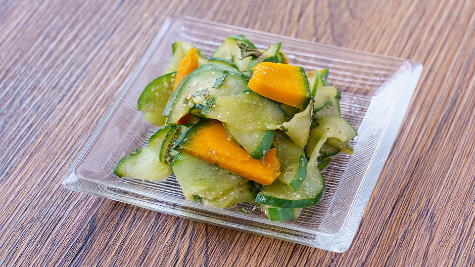 取り出した蒸しかぼちゃは、スライスしたきゅうりとしそ、ドレッシングで和えてサラダに。気づけばもう一品増えていました。中心は食感残る蒸し加減で、シャキシャキきゅうりと好相性。あるものでさくっとつくる。これぞ、ばっかし料理の真髄です。