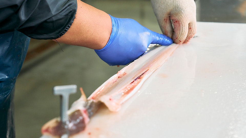 穴子が加工場に到着したら素早く活き〆し、スピーディに開きにします。百年さんが「私が知る中で一番の腕前ですよ」と胸を張る職人さんが捌けば、ものの30秒で白身が光るきれいな開きに。