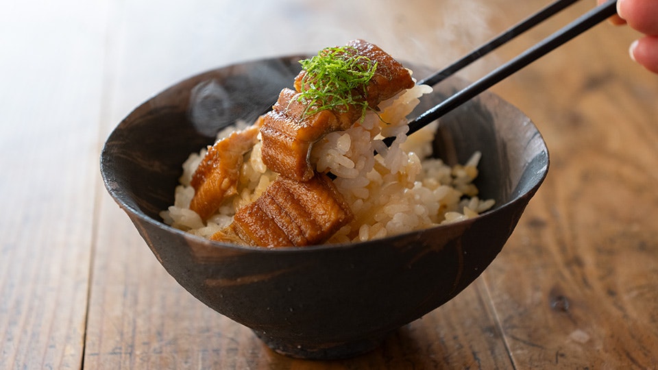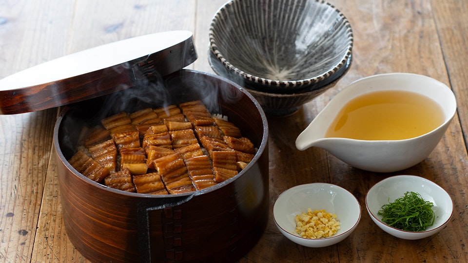 その味わいから、対馬の自然の豊かさが伝わる「黄金あなご®のひつまぶし」。ぜひ食卓でお楽しみください。