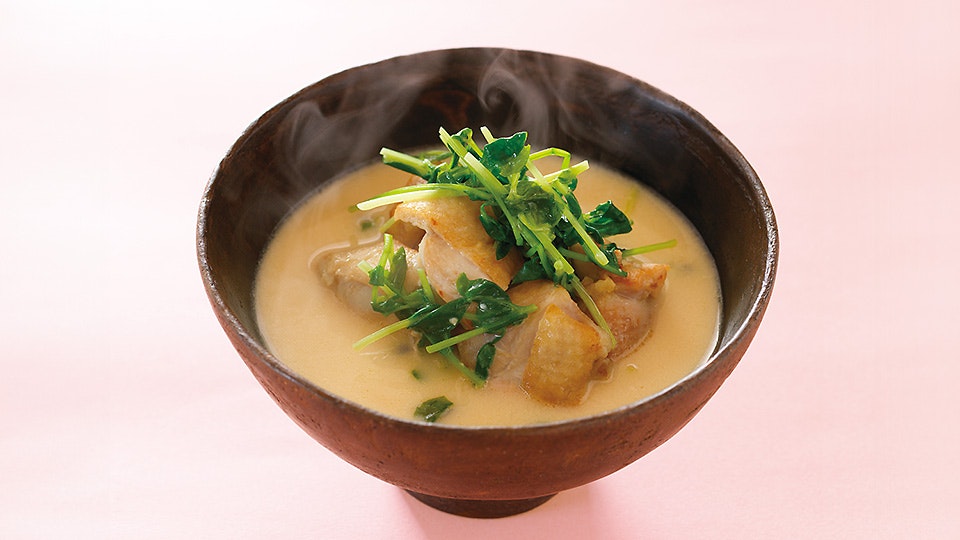 鶏肉のたんぱく質、豆苗のβカロテン、豆乳のイソフラボン、味噌のビタミンやミネラルと栄養たっぷり、しかも糖質や脂質は少なめ。まさにいいことづくしでしょう?