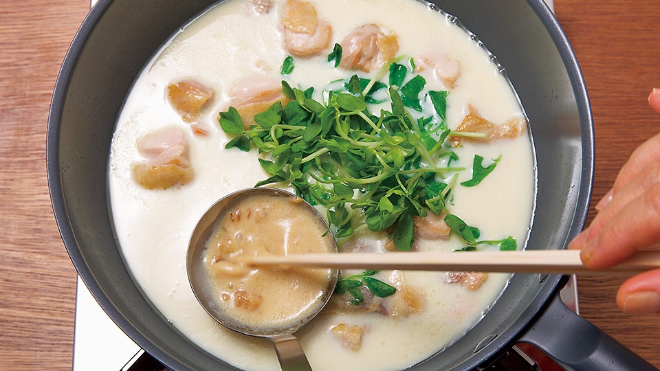 そしてもうひとつの肝は、豆乳。水と同量(200ml)入れてひと煮立ちしてから、豆苗を加え、最後に味噌を溶いてできあがりです。
