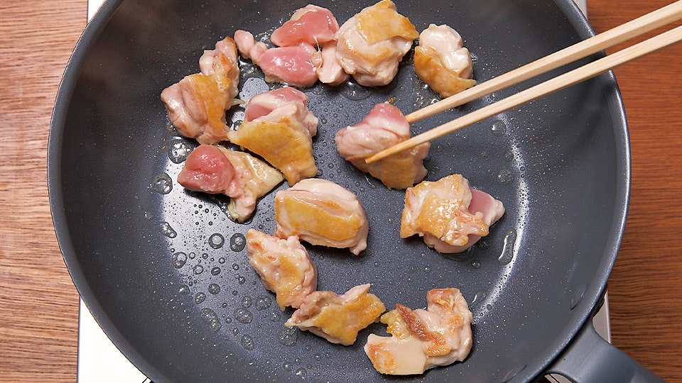 使うのは、鍋ではなくフライパンです。まずは鶏肉を中火で軽く焼いて。