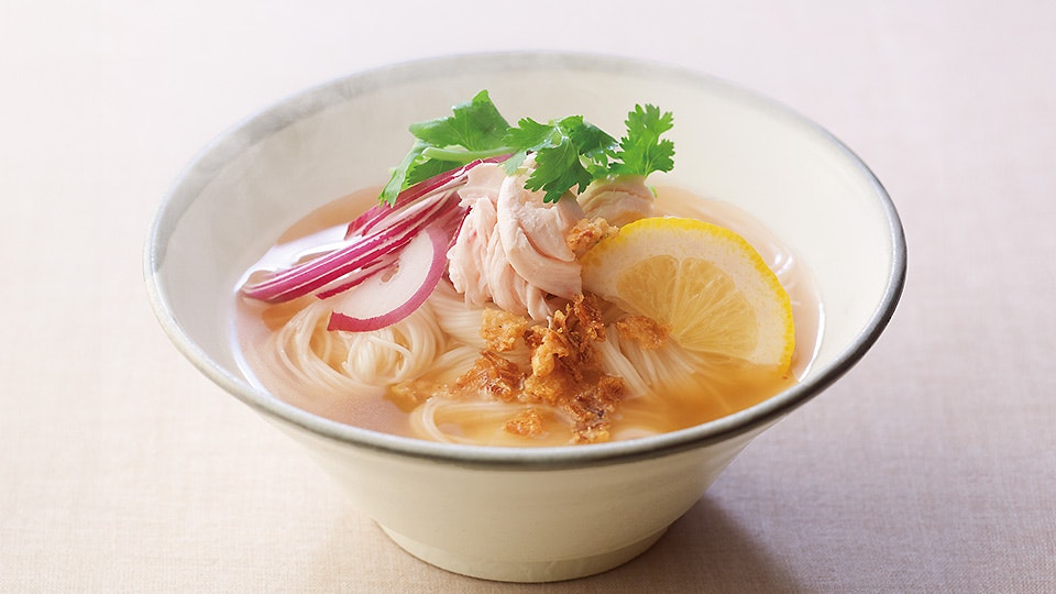 ポイントは、鶏だしを2袋使うこと。しっかりとだしのうまみがのって、やさしさの中にも浮かび上がる味わい深さ。そうめんの一気にすすれてしまう喉越しの良さと、鶏ささみの食べ応えが両立。そして要はレモンとパクチー!このパンチの効いたアクセントによって、味わいを立体的にしてくれます。