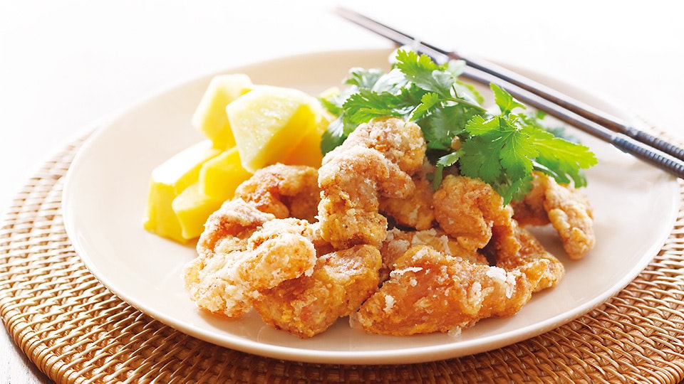 豚肉を使った唐揚げを、ひと工夫で夏仕様に。「茅乃舎だし」とカレー粉を豚肉に揉み込んで、エスニック風に仕上げます。からりと揚がった豚肉は甘みがあってジューシー、カレーの香味とだしのうまみが口いっぱいに広がります。