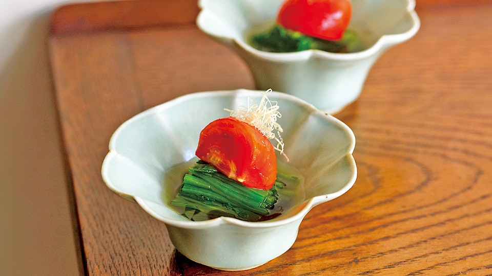 甘みと酸味が濃縮したフルーツトマト、そのおいしさをひと手間かけて上品なお浸しにしました。うまみに特化した「黄金比のだし」で煮出しただし汁をたっぷりと使います。