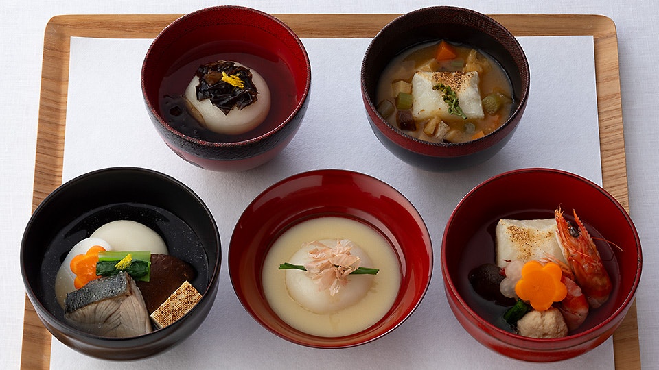5種類のお雑煮は、青森の「けの汁」雑煮、能登雑煮、江戸雑煮、京風雑煮、博多雑煮の5つです。各地域に伝わるお雑煮に基づきながら、茅乃舎風のアレンジを加えました。