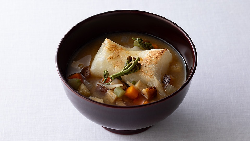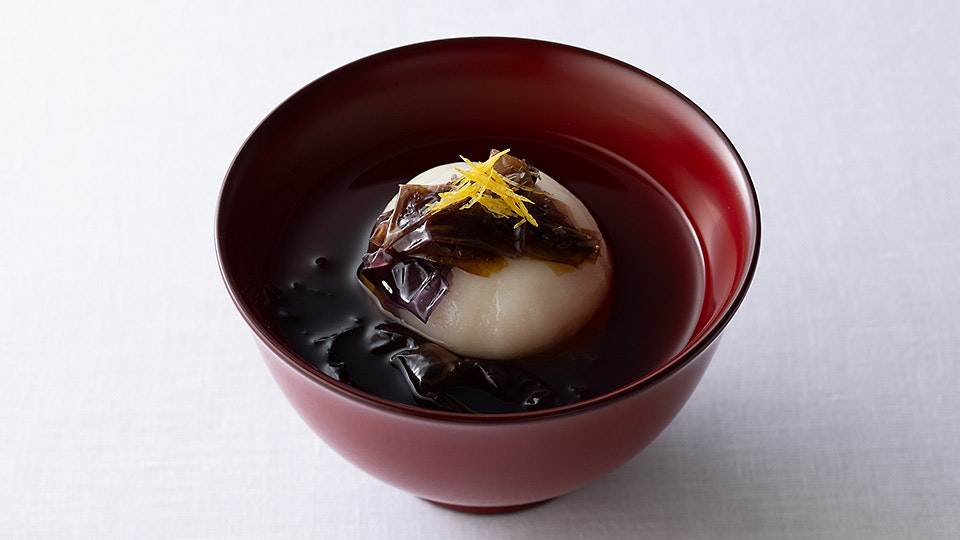 東西お雑煮のちょうど境界にあるのが石川県。地域によって様々ですが、能登半島には「あごだし」を使った岩海苔のお雑煮があります。磯の風味があふれた清々しいお雑煮に、香り立つ柚子を添えました。「海苔だけのお雑煮はびっくり」「驚いたけど美味しかった」という声をいただきました。
