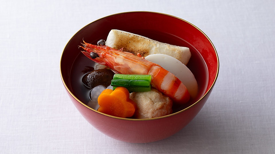 関東風雑煮とも呼ばれ、広い地域で似たものが食べられている「江戸雑煮」。小松菜、鶏の組み合わせで「なとり=名取り」で名を上げる、「ミソをつける」を嫌っての醤油仕立てと、武家らしい縁起担ぎの組み合わせ。車海老やかまぼこを使い、彩りよく盛り合わせるところに、江戸の粋を感じます。今回は、うまみある鶏つくねを加えました。