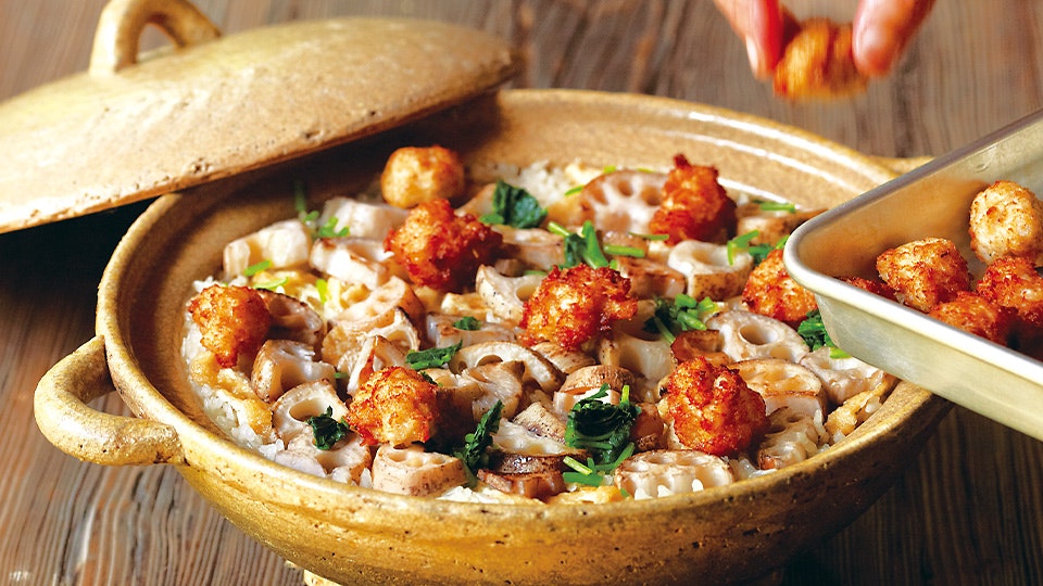 母がつくっていた蓮根の炊き込みごはん。今は老いた母に、だしを使って私がつくっています。大変な時は、蓮根団子はなしでもおいしいです。