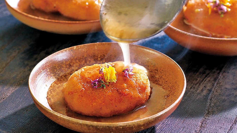 2号から関わるフードスタイリストが、もてなしの食卓に出しているというのがこちら。蓮根のとろみと、だしの餡が上品な一品です。もっちり、とろりとした食感は和食ならではの特別感。“てまひま”が伝わる和のおいしさが詰まっています。