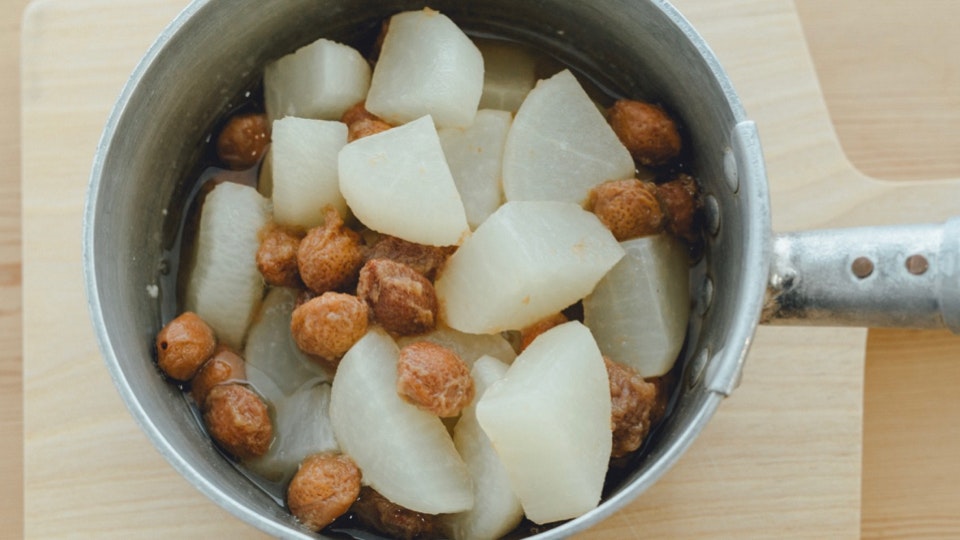 ① 鍋に水とだしパック1袋を入れて火にかけ、沸騰したら2〜3分煮出して、パックを取り出す。