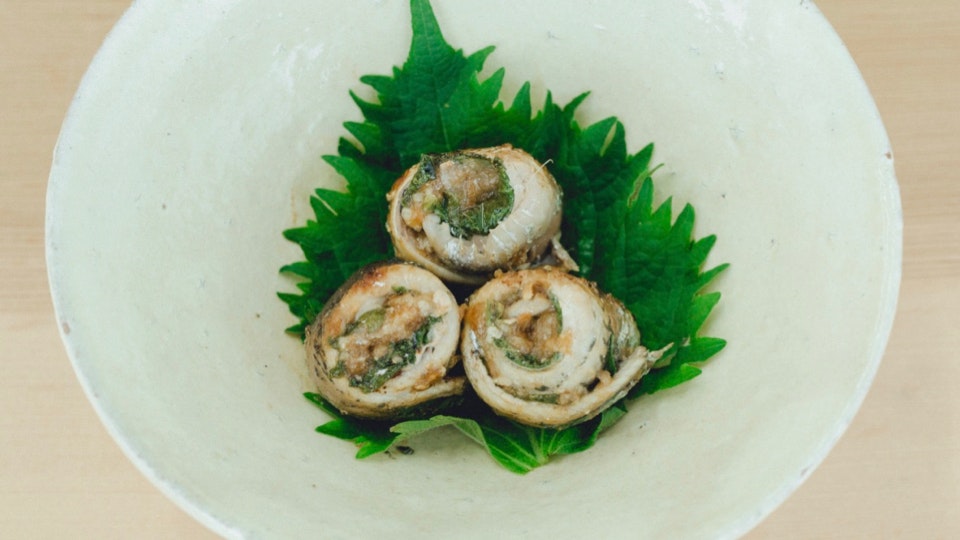 ③ いわしの上に②の大葉をのせて巻き、爪楊枝をさして留める。