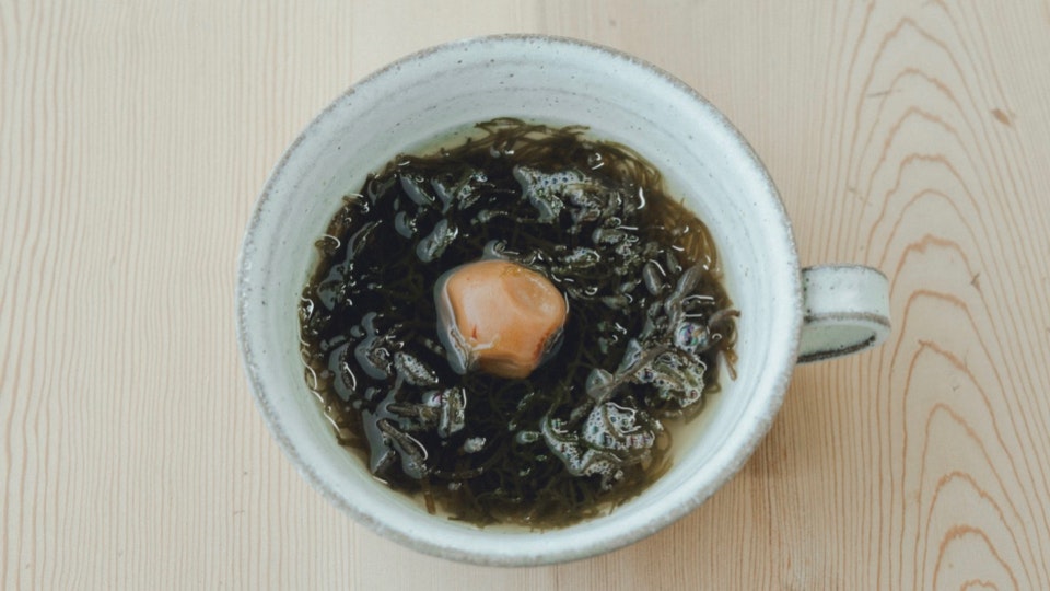 梅干し2粒、もずく2パック、水400ml、茅乃舎だし1袋、薄口醤油小さじ3、酒小さじ2