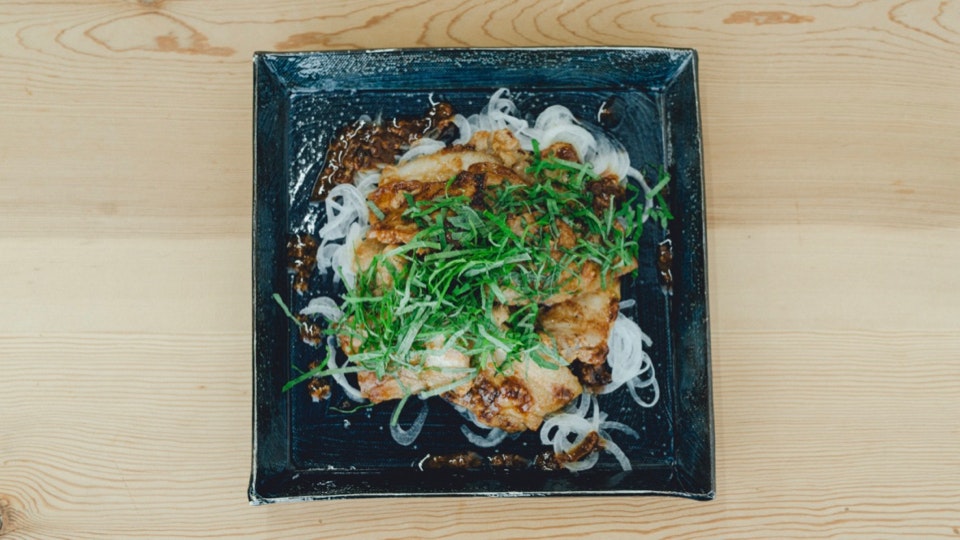 ⑥ ③の玉ねぎの上に⑤を盛り、④の大葉をちらす。
