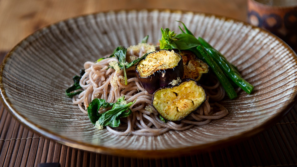 たっぷりのハーブと香ばしい麺が相性抜群。仕上げのフィンガーライムで、プチプチ食感と爽やかな柑橘の風味をプラスします。サクサクのいんげん、とろりとした焼きナスも◎。