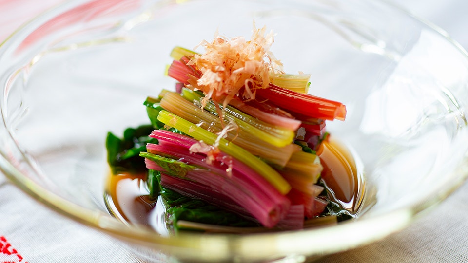 美しい色が目を引くスイスチャードは、実はビーツの仲間。クセがなく食べやすい味わいで、サラダや炒め物などに使われます。今回は、しゃきしゃきの食感を生かしてお浸しにしてみました。