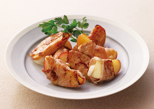 - 豚肉を広げて野菜だしをまんべんなくふり、1を1切れずつのせてくるくると巻く。