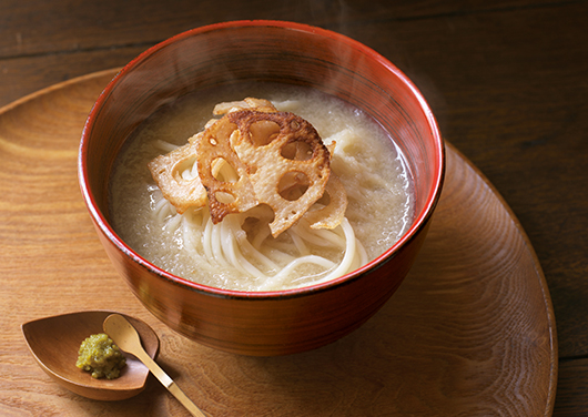- 器にうどん、素揚げしたれんこんを盛り、3を注ぐ。お好みで柚子胡椒を添える。