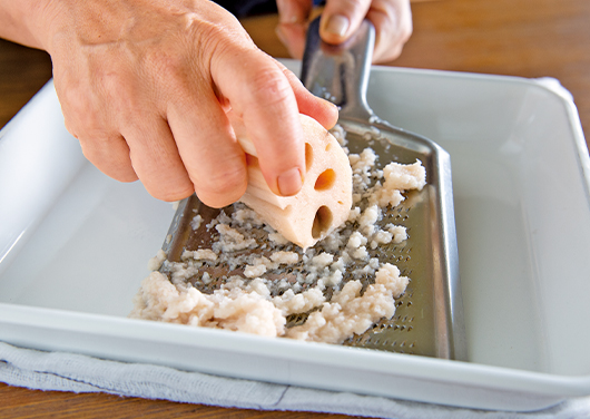 - 作り方1では、れんこんが小さくなり、おろしにくいと感じたら手を止めます。残ったれんこんは、薄切りにして素揚げします。