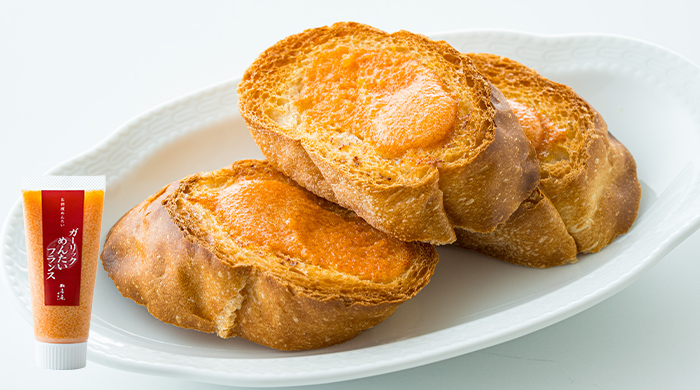 粒感豊かなめんたいこに、パンによく合う豊潤なバターと香ばしいにんにくでシンプルに仕立てました。