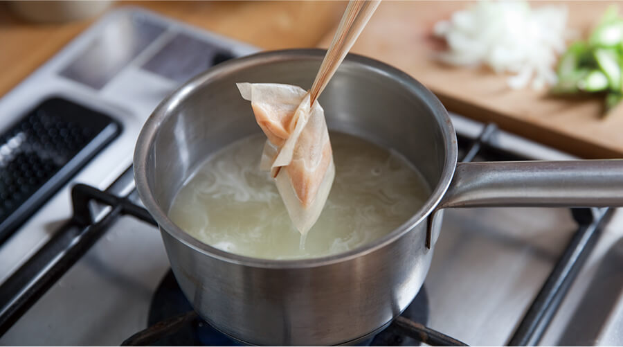 「朝のスープこそ、手軽においしいだしを」と広沢さんが手にしたのは、茅乃舎の「昆布だし」。じんわり沁みるうまみが素材を引き立てます。しかも煮出すだけなので、とっても簡単。忙しい朝の味方になってくれます。