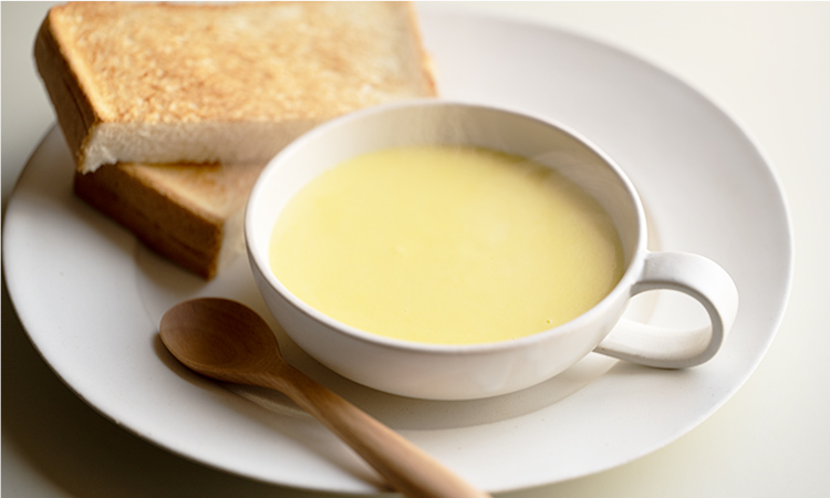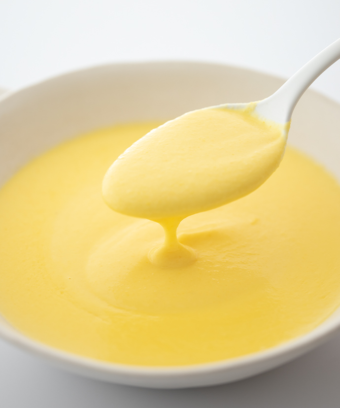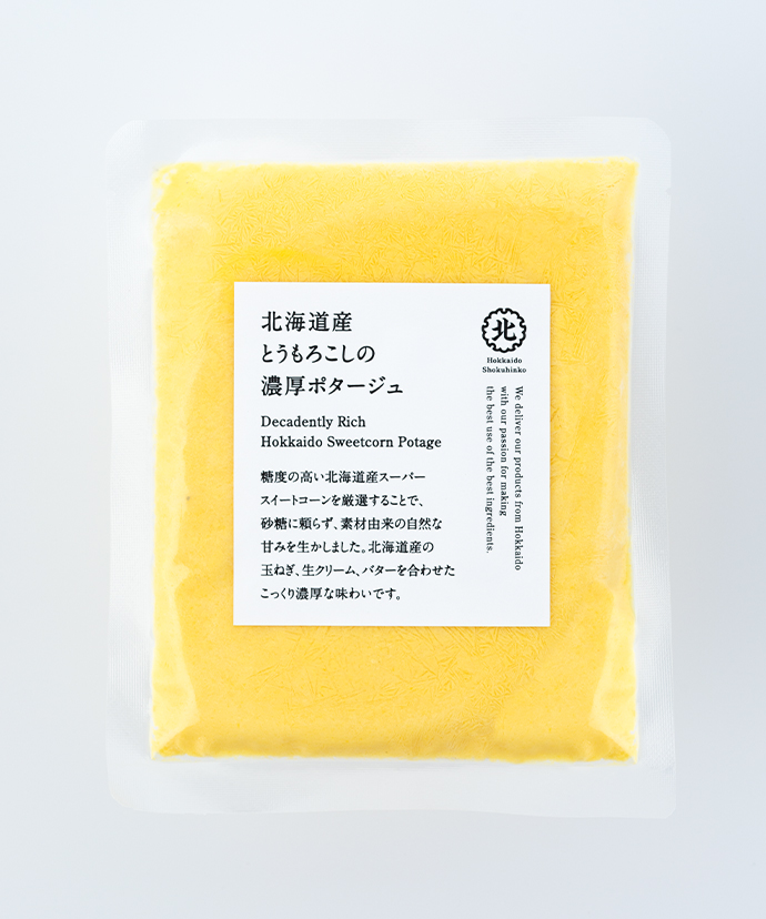 ポタージュでもっともこだわったのは、とうもろこしそのものの素材の甘みを大切にすること。 北海道産のとうもろこしの中でも、糖度の高いものを選定することで、砂糖に頼らず、素材の甘みで、こっくりと濃厚に仕上げることができました。