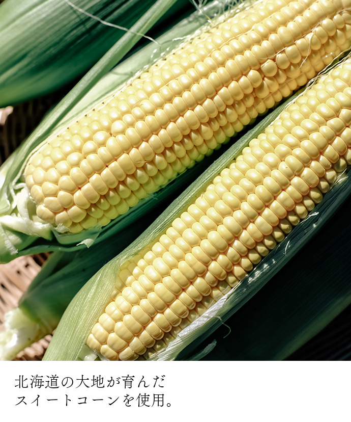 スイートコーンの中でも、特に甘みが強い“スーパースイートコーン”という品種を使用。北海道を回って探した、厳選したとうもろこしの素材のおいしさを生かしておつくりしています。